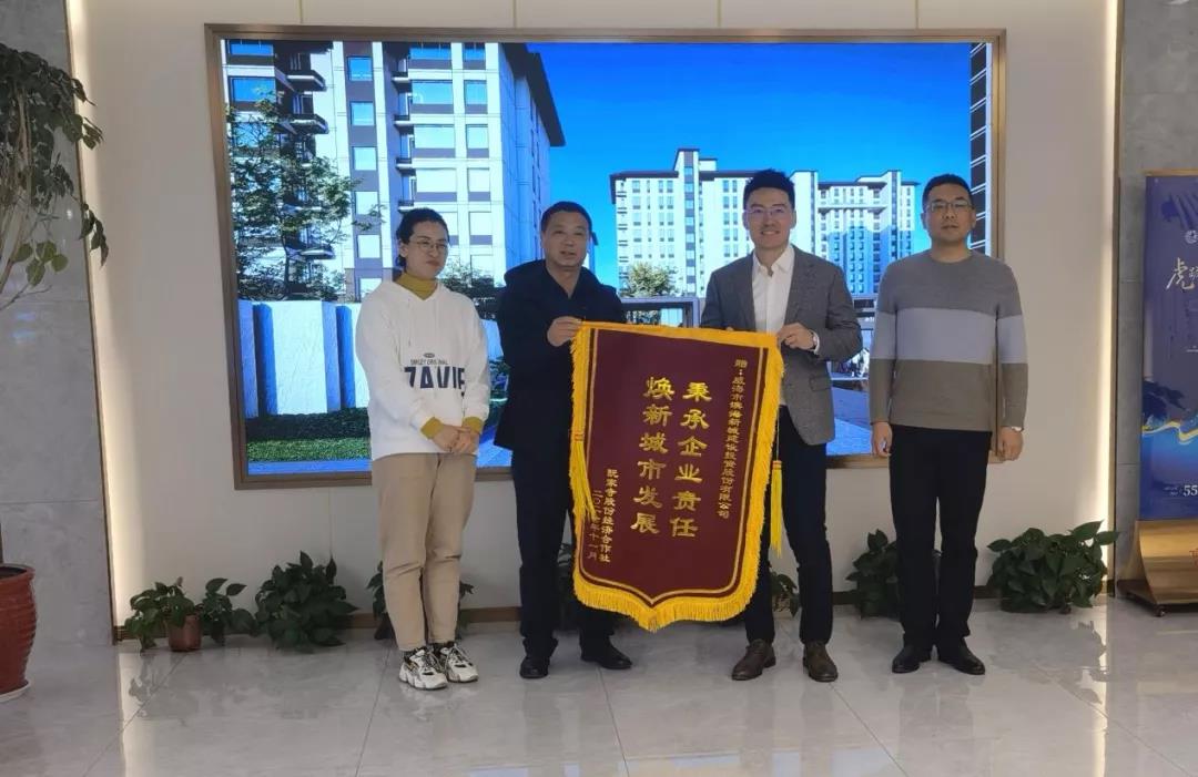 看完项目现场,一行人心里既踏实又满足,大家相约再去项目售楼处聊一聊。话还没说几句,阮家寺经济股份合作社理事徐振江拿着一面锦旗赶来,“不光要感谢区管委和街道的大力帮助,我代表村集体和回迁户们,还要好好感谢一下开放商滨海城投,积极承担社会责任,无论是回迁方案、项目规划布局还是建设速度,我们都十分满意,两年多来的合作非常愉快!”说着,徐振江将锦旗送到高业程手中。