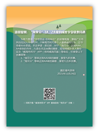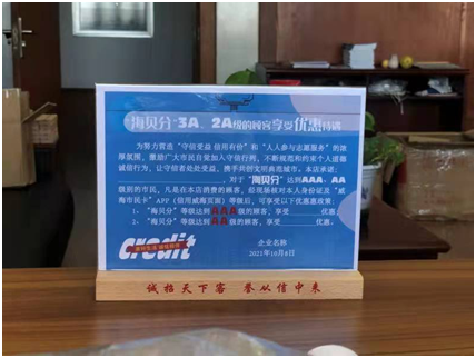 强化“信易+”应用场景规范性。凡是加入“融爱·高新”爱心商企联盟的市场主体,结合经营特点推出的信用惠民政策必须进行公开承诺、盖章生效。同时,高新区信用管理办公室根据爱心商家特点,统一印制发放宣传海报或桌牌,主要内容涵盖商家承诺事项、推出的信用惠民政策以及“威海市民卡”APP二维码。