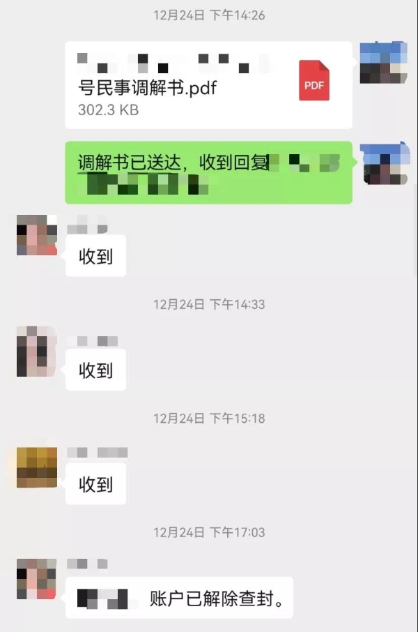 12月24日,法官群内确认双方调解意见。14:26微信群向原被告双方确认送达调解书,17:03微信群通知被告账户已解除查封。