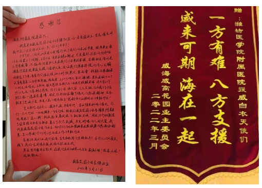 3月21日,泰和社区业委会为潍坊医学院附属医院送去了锦旗。威高花园小区45号楼701室的居民,代表全体居民写了一封感谢信,感谢全体医护人员的辛苦付出。