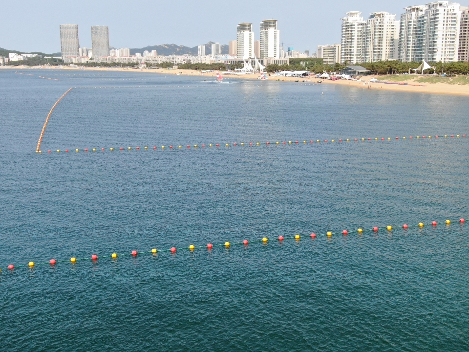 据介绍,今年国际海水浴场布设的泳区共有6个,总面积23.5万平方米。为使泳区界限更加分明,易于辨识,每个泳区采用红黄两色安全浮漂相间连接围成,下有铁锚进行固定,并在泳区内的深水部位安插多面醒目的警示旗,告诫游泳者游到深水部位时注意安全。