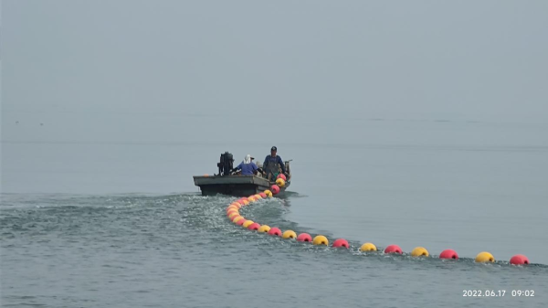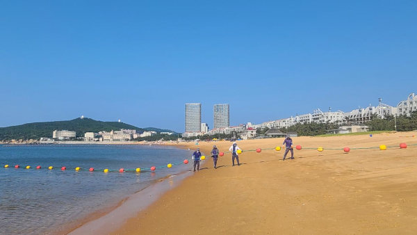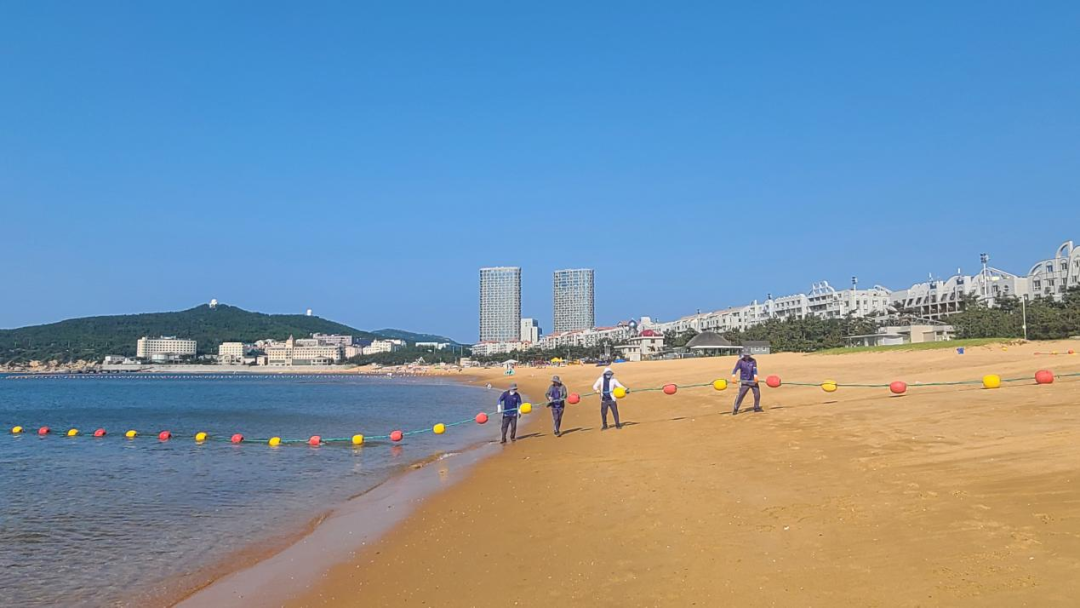 6月16日,威海国际海水浴场开始布设警戒线。在机动船的牵引下,工作人员能过布设海上安全浮漂,划定游泳警戒线,为市民和游客打造安全游泳区。
