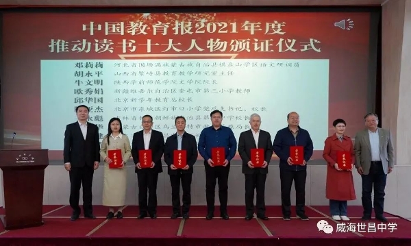 近日,由商务印书馆和中国教育报联合主办、中国语言资源开发应用中心和北京语言文字工作协会协办的“第十届读书论坛”在京召开,《中国教育报》2021、2022年度推动读书十大人物颁证仪式同步举行。威海市世昌中学校长于志健作为2021年度推动读书十大人物,现场获颁证书,并作为代表做了题为《晚风悄撒种,天明万物长》的获奖演说。