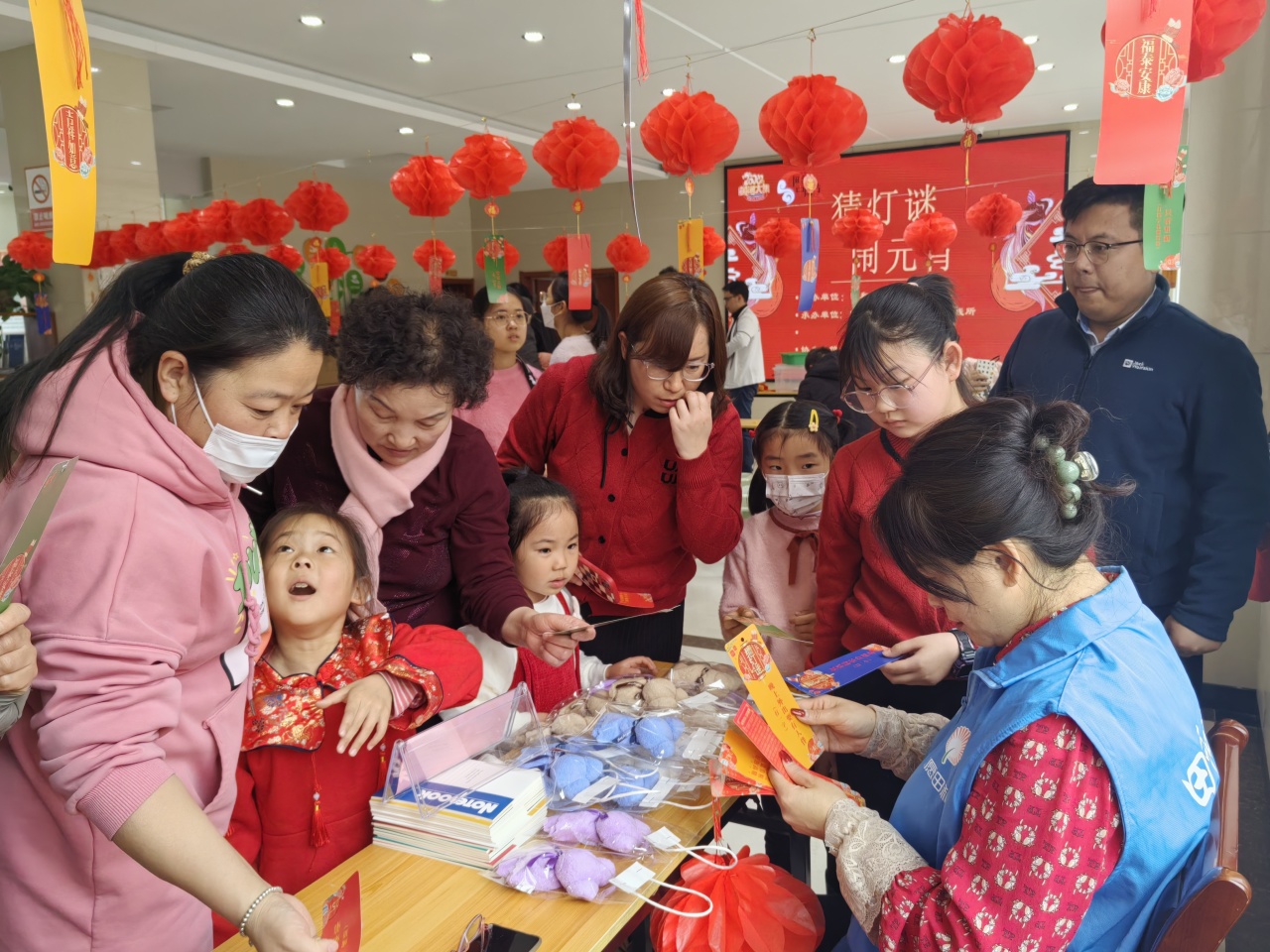 一条条灯谜悬挂在盏盏红灯笼下“翩翩起舞”,大家纷纷围拢驻足,用手比划着思索答案,你一言我一语地讨论,现场一片欢声笑语,传统文化的魅力在活动中潜移默化地浸润着人心。