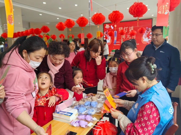 一张张谜题丰富多彩,一个个谜面妙趣横生,“我猜到了!原来是这样啊!”活动现场欢声笑语,此起彼伏。“今天的活动很有元宵节的氛围,今年的灯谜内容很有意思,不仅有日常科普知识,还有很多趣味问答。”新田社区李大哥和孩子猜对了两条灯谜,拿着刚兑的小礼品,开心地说。
