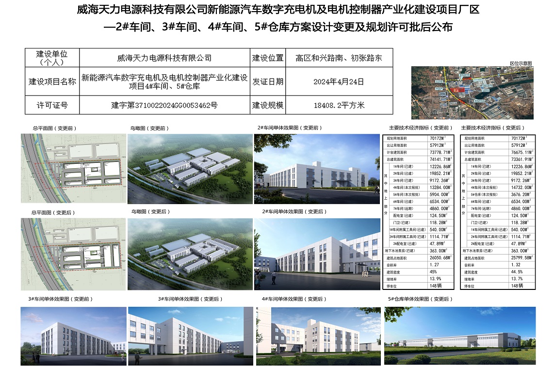 威海天力电源科技有限公司新能源汽车数字充电机及电机控制器产业化建设项目厂区—2#车间、3#车间、4#车间、5#仓库方案设计变更及规划许可批后公布