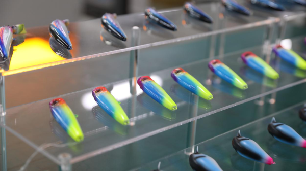 平均4秒完成一只鱼饵的喷涂,通体8种颜色让鱼饵栩栩如生,喷枪精准定位、“不差分毫”地点上鱼眼的颜色……智能制造部里,一条鱼饵自动喷涂生产线正在进行检测,历经1年研发,这条生产线一经面市就备受威海众多渔具企业青睐。