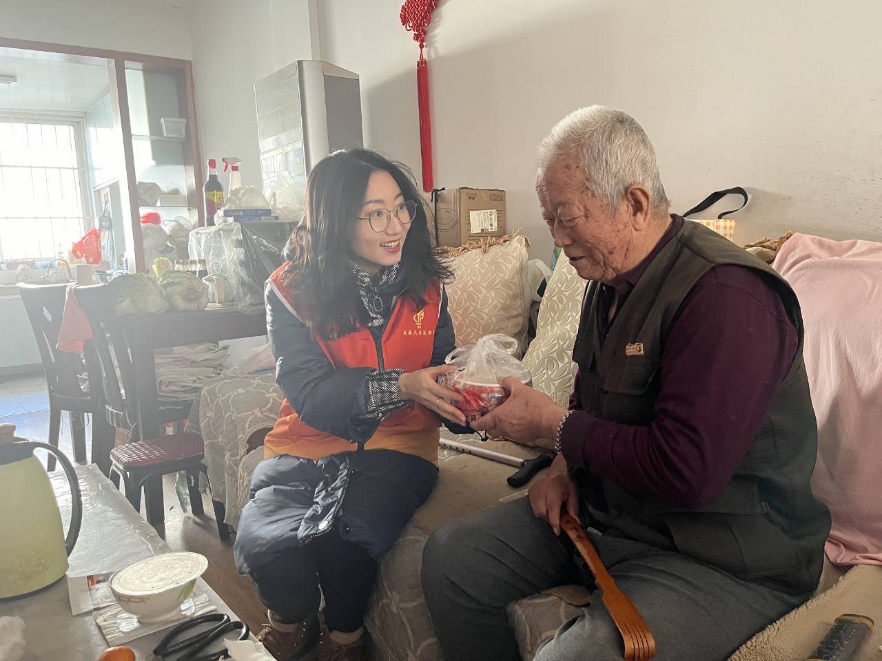 道路上雪清得及时,社区里暖心事不断发生。上午10时许,田和街道宏泰社区“送菜小分队”将一包刚刚采购的新鲜蔬菜和生活用品送到了高龄老人孟奶奶的家中。“雪大路滑,您最近尽量不要出门,有需要就联系我们。”社区党总支刘洋叮嘱道。