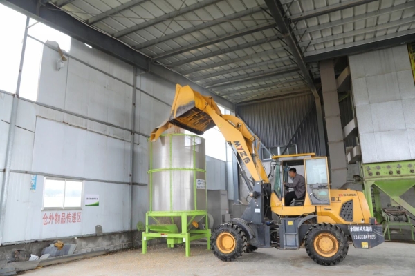 在距离马石泊村不远的威海洪涛农林综合服务有限公司厂区内,同样是热火朝天的作业画面。铲车将刚从田间运来的湿玉米缓缓倾注到烘干机中,经过设备处理,原本潮湿的玉米逐渐变得干燥,为后续储存做准备。
