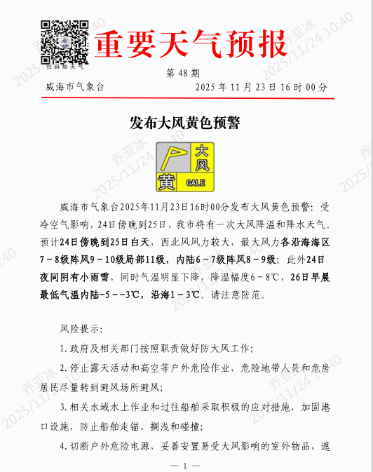 发布大风黄色预警