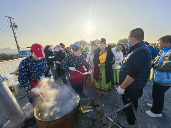 与此同时,美食大集区域的“百家饺子宴”将活动推向又一个高潮。一口巨大的铁锅架起,柴火熊熊燃烧,锅内热水沸腾。工作人员分批将50斤水饺下入锅中,热气氤氲、香味扑鼻,供市民游客免费品尝。大家围聚在一起,分享这碗饱含温情与祝福的饺子,场面温馨而融洽。
