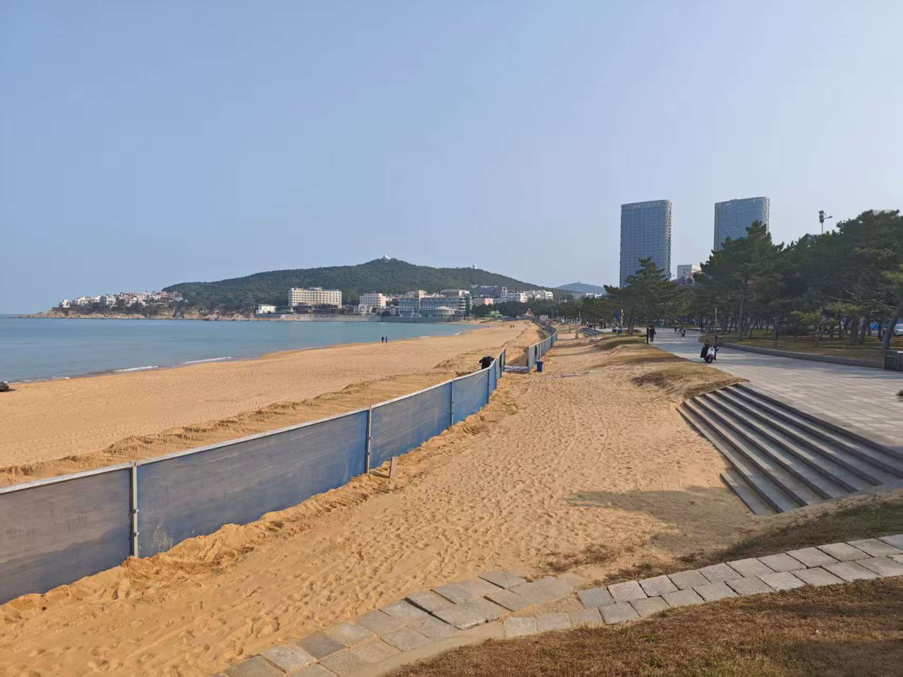 “每年这个时候,强劲的北风频繁‘打卡’,沙滩上的沙就像‘长了脚’,经常会往岸边的路上和绿地里跑,影响了环境也妨碍了出行。”浴场管理相关负责人指着安装好的防沙网说。这些网面采用高密度聚乙烯材质,网孔设计可有效挡沙阻风,立柱框架为耐腐蚀的镀锌钢材料,经得起海风和海水的双重“考验”。