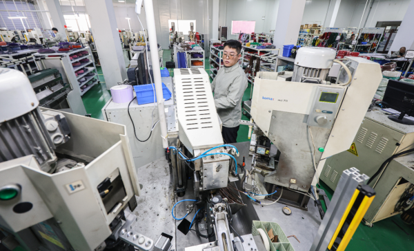 在公司一楼生产车间,自动裁断压接机、喷码裁断压接机、自动防水塞裁线机等29台自动化设备有序运转,绿色运行灯与红色警示灯交替闪烁,实时反馈裁线、压接、线束热缩等各环节生产进度。智能制造管理平台的大屏上,9条流水线的生产任务、完成进度及质量预警数据一目了然,实现生产全流程可视化管控与无纸化办公。“通过数字化赋能,公司整体生产与办公效率提升了10%。”公司设备主管赵培斌说道。