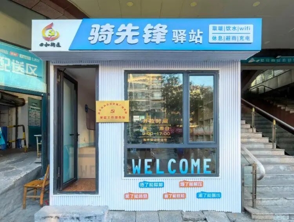 而在距离此处2.5公里的欧乐坊商圈的骑先锋驿站则紧邻骑手停车点而建,方便骑手们到驿站里休息。