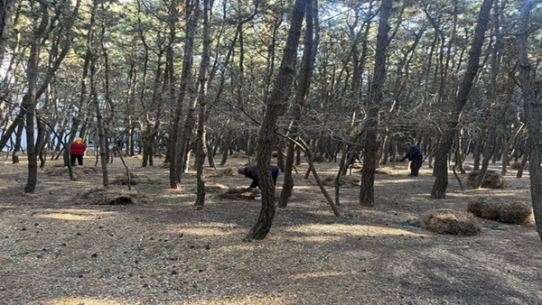 林海公园是依托原有的海防松林建设的大型生态休闲公园,面积大,林木密,游人多,防火压力很大。在该公园清理现场看到,园林工人们分工协作,利用耙子、手锯、剪刀等工具,将林下厚厚的松针、松枝、杂草等仔细归拢、捆扎打包,然后用小推车推至公园外装车运走。