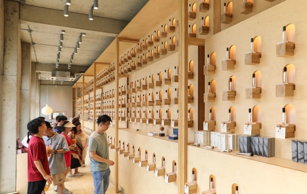 主街上,新入驻的德克士与香水馆形成亮眼组合,视觉效果清爽。香水馆内,一整面独特的香水墙排列考究,兼具美感与实用性:一旁的“书亦烧仙草”则以暖黄色调为主,墙面上拓印着书法家题写的“火炬八街”几个大字,成为新的拍照打卡地标。