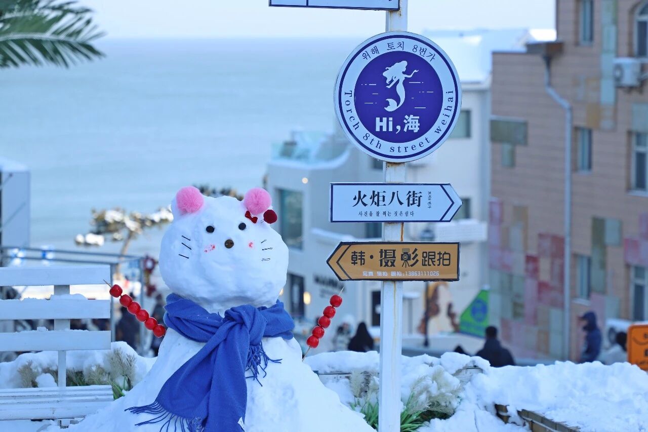 当雪花轻落在火炬八街,这条本就色彩明快的街道更添浪漫韵味。在这里,雪的纯净与海的辽阔”演绎得淋漓尽致。作为被誉为“威海小镰仓”的网红地,火炬八街南高北低的坡道被白雪覆盖,两侧暖白色建筑错落有致,尽头的蔚蓝大海与皑皑白雪形成鲜明对比,随手一拍都是氛围感拉满的冬日大片。游客们或漫步雪中街道,或用镜头定格美景,欢笑声与凛冽海风交织,更添惬意氛围。