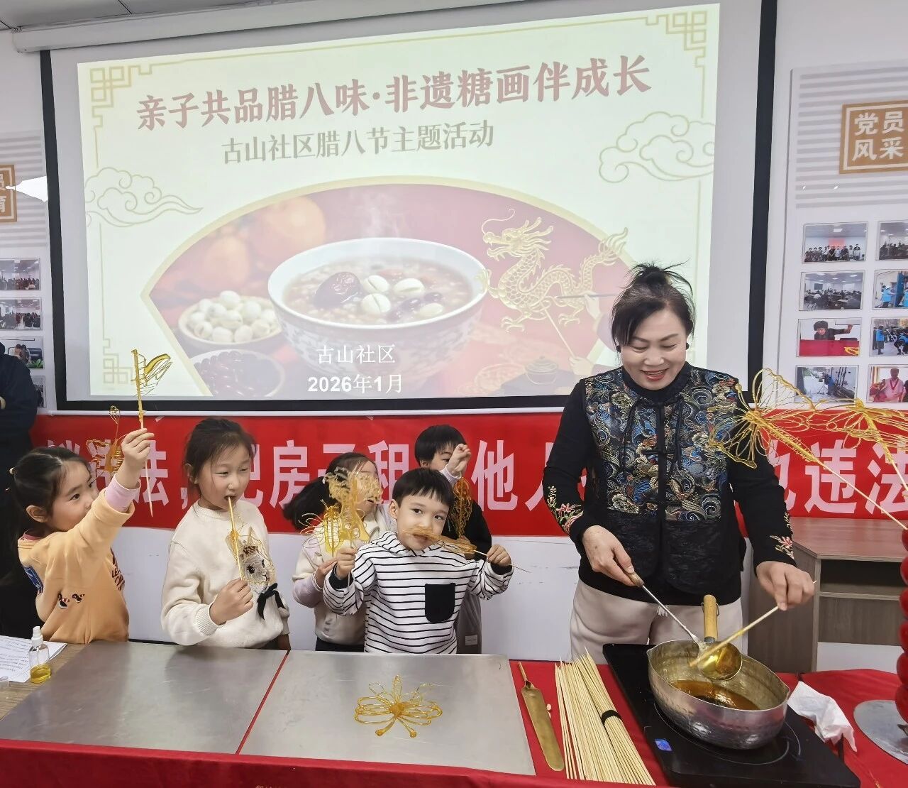 云海、泰和、毕家疃等社区组织居民共腌腊八蒜,大家协作装蒜、倒醋、加糖盐,在忙碌中寄托对新春的期盼。槐云社区熬煮腊八粥,分装后送到独居、孤寡老人家中;垛顶山社区网格员入户走访高龄困难群体,促膝长谈问需求、送祝福。东涝台社区开展“五谷纳福·粥暖万家”亲子手工活动,家长孩子携手用谷物粘贴福字;古山社区推出非遗糖画体验,孩子们在传承人指导下勾勒甜蜜图案,感受传统技艺魅力。