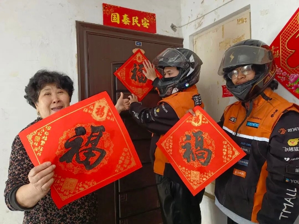 写罢福字,骑手们化身爱心使者,与街道工作人员一起,带着亲手书写的福字和春联,上门为老人贴春联,把新春的祝福送到老人心坎上。春联映着老人的笑容,也彰显着骑先锋志愿服务队“奉献、友爱、互助”的志愿精神。
