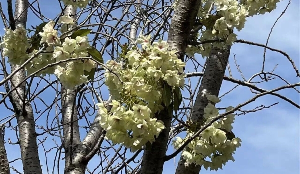 这株绿樱正是樱花品种中的珍品——郁金樱。它以独有的清新花色,为春日街景增添别样风情,带来别具一格的“绿色惊喜”。据园林专业人士介绍,绿樱是樱花家族中极为稀有娇贵的晚樱品种,以郁金樱、御衣黄为代表,属于花叶同放的樱花品类,有单瓣、重瓣之分,以重瓣居多,花期约10天。不同于大众熟知的粉白樱花,郁金樱自带独特的“渐变滤镜”。初开时,花瓣呈淡黄绿色,像春日里刚冒头的嫩芽,带着几分青涩;随着花期推进,花芯会慢慢晕染出嫩粉色,而花瓣边缘依旧保留着淡黄绿色,半绿半粉的模样,兼具温柔气质与观赏价值。